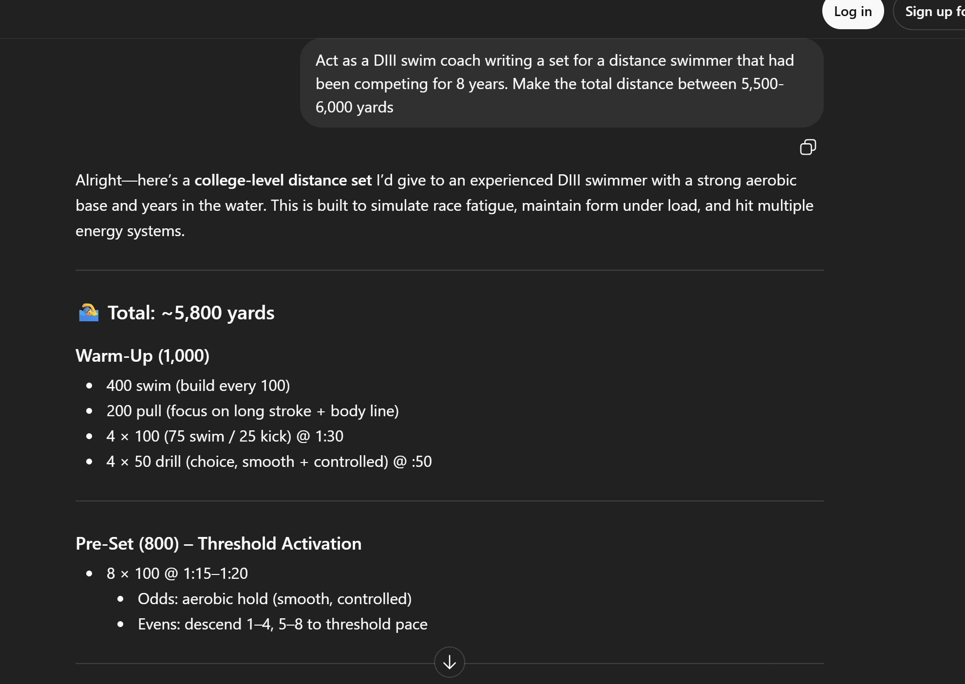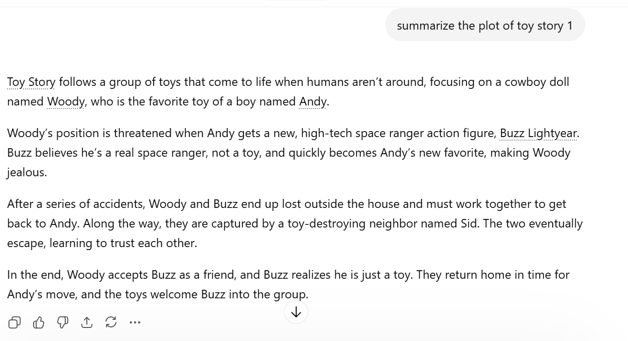 to summarize Toy Story and then I asked it to “summarize Shrek.” Both of these summaries were 8-10 sentences, not nearly enough to fully grab details from a film. The prompt pattern that made the biggest difference was giving it structure. I asked for it to give me a paragraph for each scene and it was much more detailed and searched the web before it did it, so it clearly found the things from the internet. After this, we asked it to help us all run faster in a month and it spit out a plan without knowing any details about us. I then used the reverse conversation method and asked it to ask us details about our height, weight, diets, sleep patterns and other details and once we answered those, it gave us a more detailed, precise plan that would last a month and it gave us an end goal. Overall, I learned that AI is good for outlines and specific plans, but only with specific details. In order to get good results, the user must be specific with their prompts and their results will continue to improve, especially when involving health desires. This draws back to the prompt literacy text that we went over for the week of March 31, where we discussed the benefits and issues behind AI.